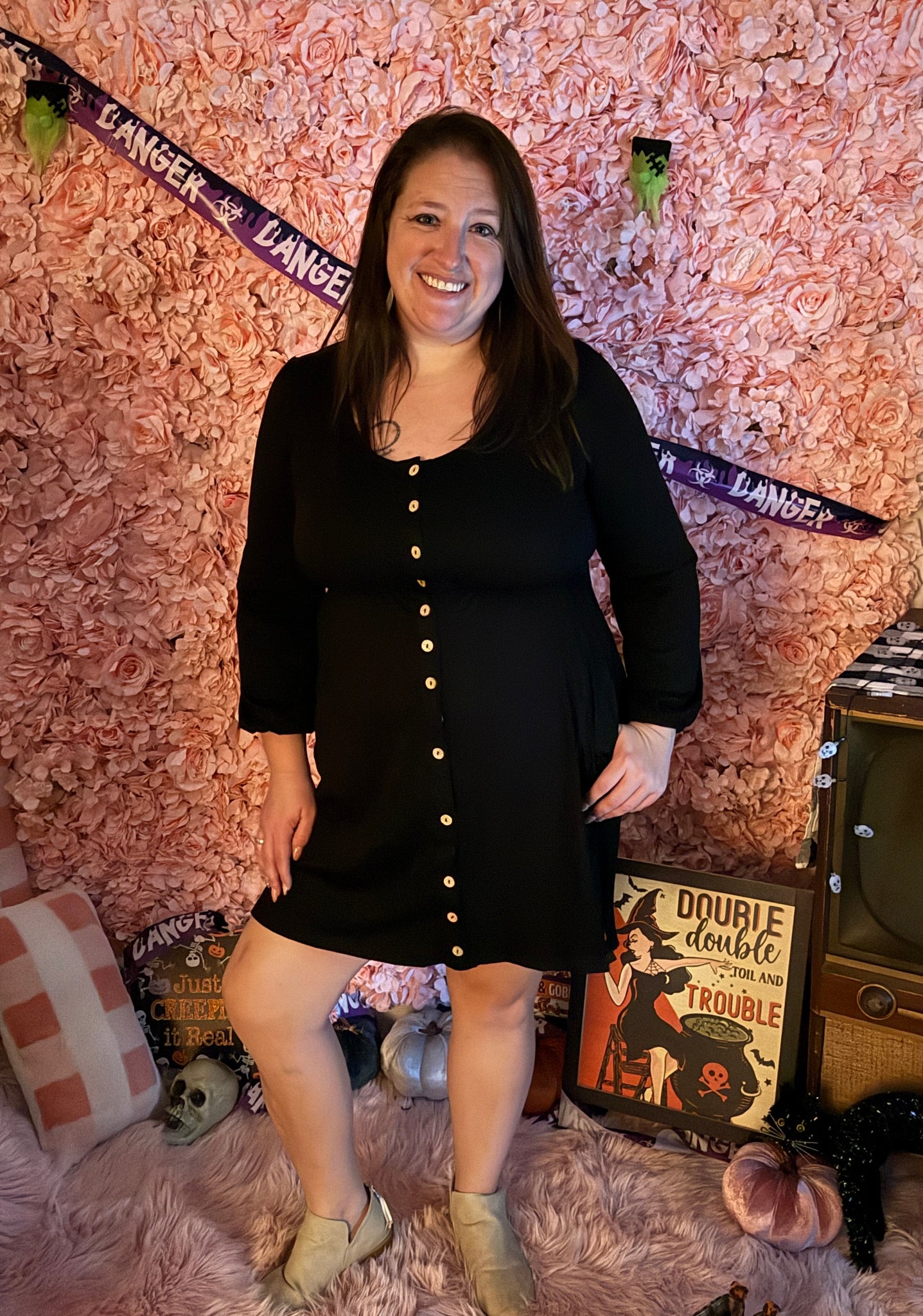 Black Long Sleeve Dress With Button Up Detail Down Center.