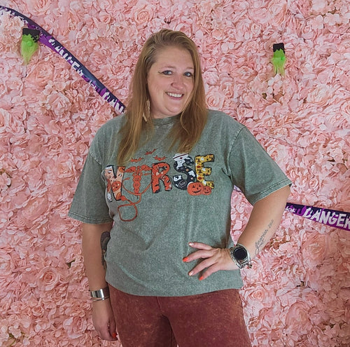 Mineral Washed Tee With Halloween Themed Nurse Across Front