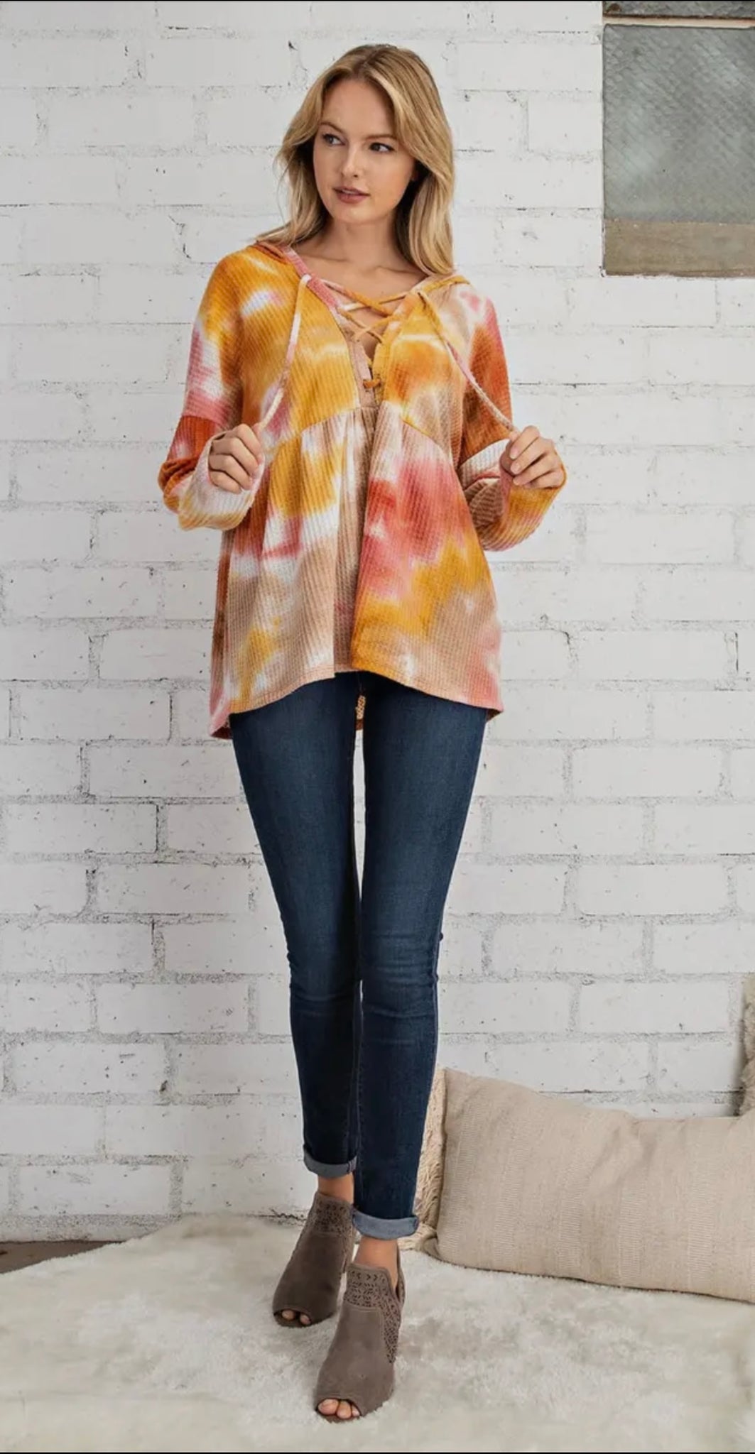 Tie Dye Waffle Knit Top With Criss Cross Front & Hood. Yellow, Orange, Red. Very oversized.