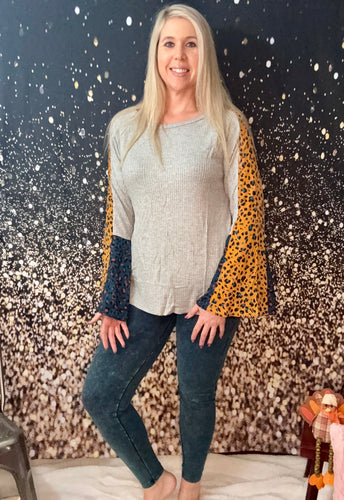 Oversized Grey Waffle Knot Shirt With Color Block Leopard Print Sleeves