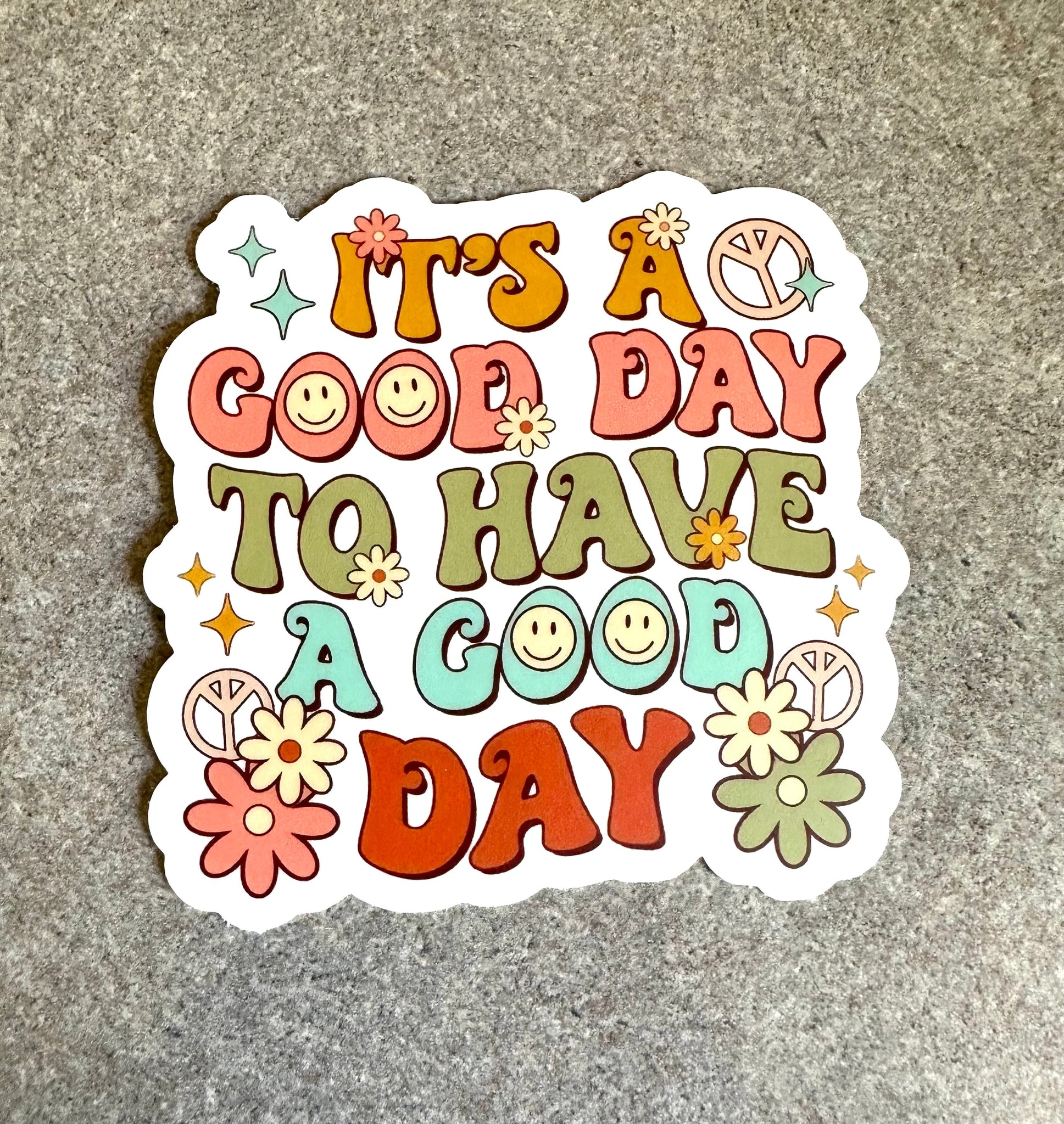 For the optimists, the joy-chasers, and the ones who believe in setting the tone for a good day, the "A Good Day to Have a Good Day" vinyl sticker will help remind you to have a great day. Featuring a retro bubble font, a vintage-inspired color palette, and cheerful graphics like daisies and happy faces, this sticker brings all the positive vibes you need.